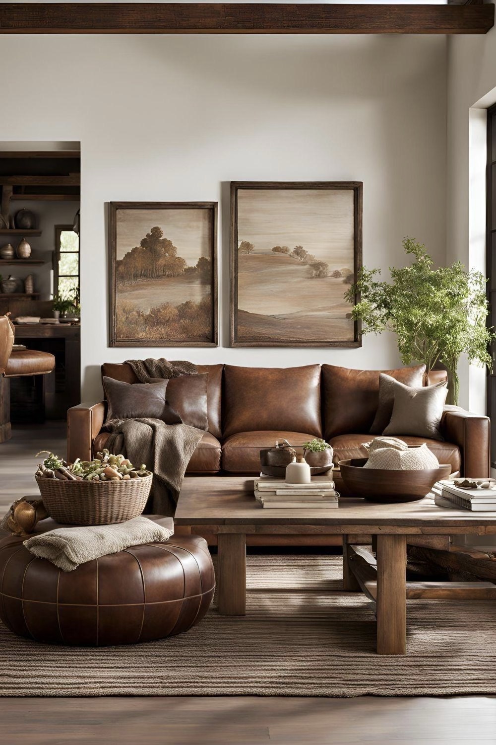- Canapeaua din piele naturală: Pentru un contrast veritabil, pielea naturală (în nuanțe de coniac, cafeniu sau maro roșcat) aduce acea notă de „rusticitate luxoasă”. Pielea îmbătrânește frumos, capătă patină și oferă un punct de ancorare vizuală într-o cameră dominată de culori deschise. Este alegerea perfectă dacă vrei să adaugi un aer robust și nobil spațiului tău.