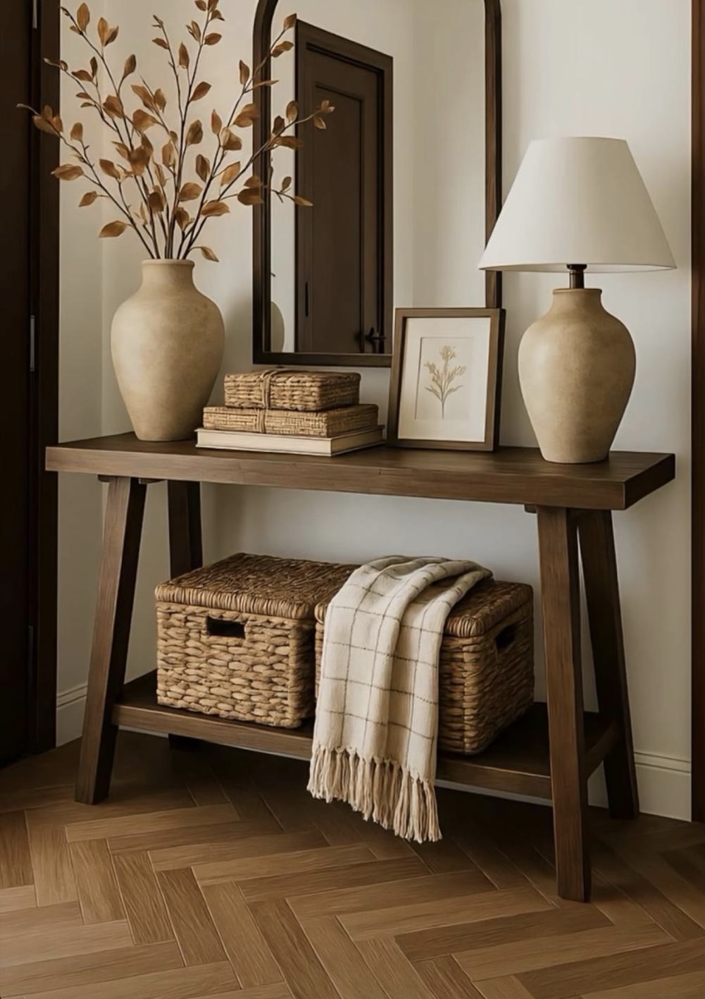 - O oglindă cu ramă lucrată manual lângă o consolă de lemn creează imediat profunzime.