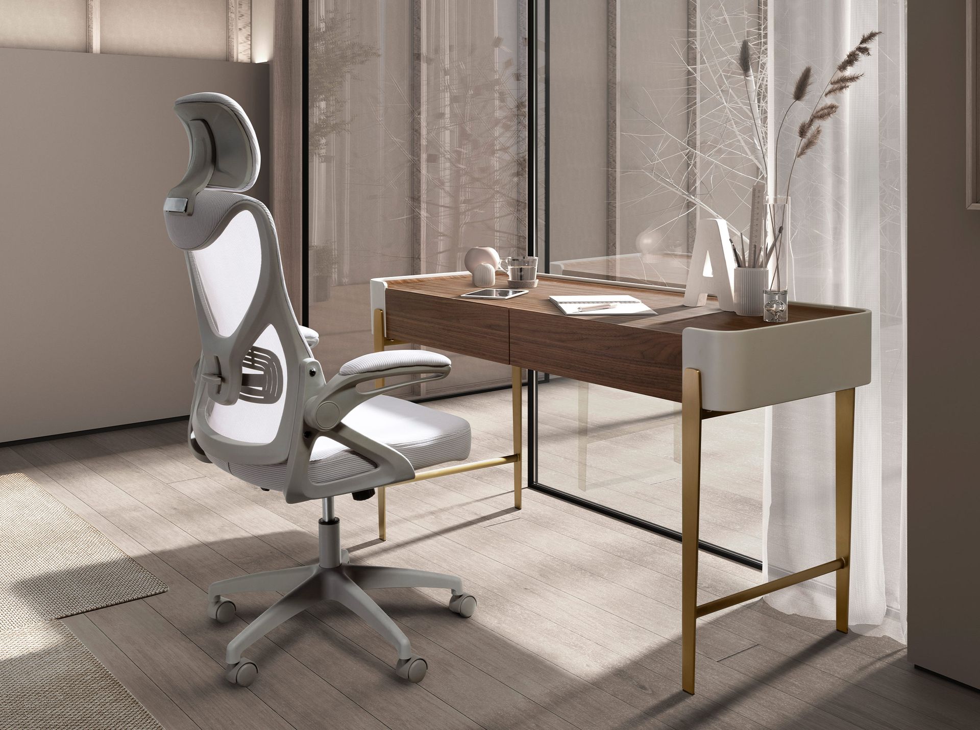 Designul picioarelor din oțel inoxidabil polisat, de culoare aurie, conferă un aer exclusivist și rafinat, asigurând în același timp stabilitate și durabilitate. Biroul dispune de un spațiu generos de depozitare, fiind echipat cu 2 sertare cu deschidere manuală și sistem de închidere soft-close, pentru o utilizare confortabilă și silențioasă.
